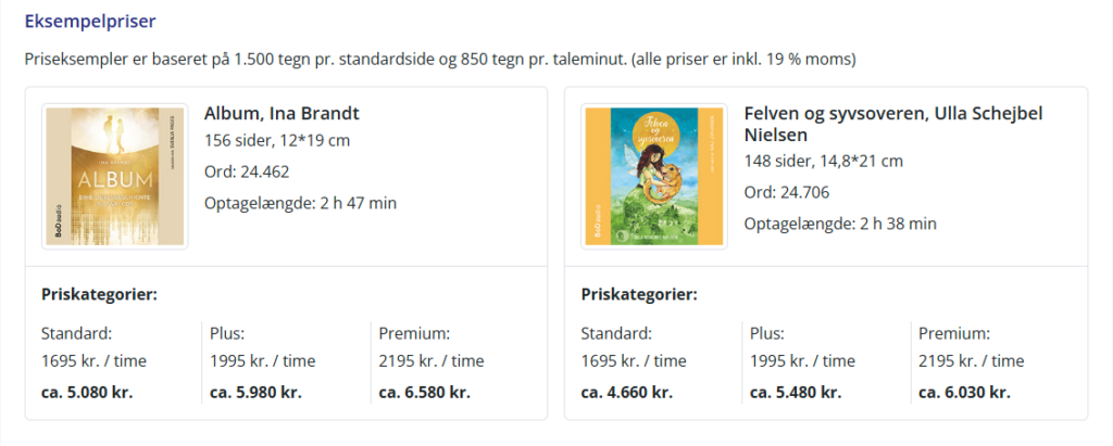 Du kan bruge vores priseksempler til at få en idé om, hvor meget din lydbog skønnes til at koste. Du får den endelige pris, når vi giver dig et tilbud på produktion og udgivelse.